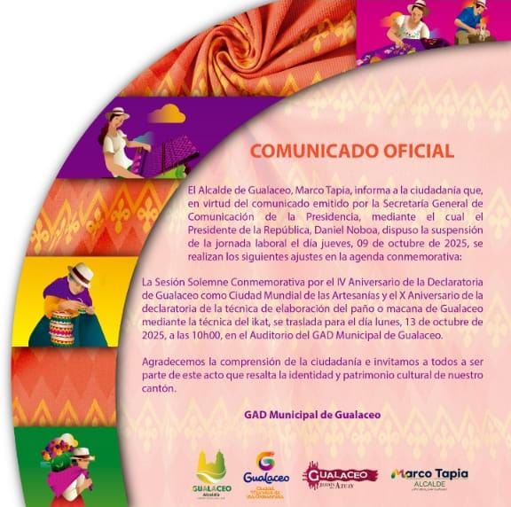 Informamos a la ciudadanía que la Sesión Conmemorativa por el IV Aniversario de Gualaceo como Ciudad Mundial de las Artesanías y el X Aniversario de la Declaratoria de la Técnica de elaboración del paño o macana mediante el ikat se traslada para el lunes, 13 de octubre de 2025, a las 10h00, en el auditorio