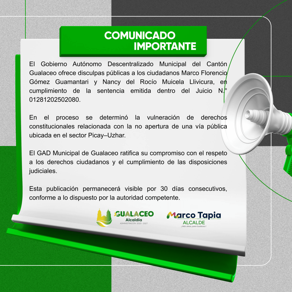 El Gobierno Autónomo Descentralizado Municipal del Cantón Gualaceo ofrece disculpas públicas a los ciudadanos Marco Florencio Gómez Guamantari y Nancy del Rocío Muicela Llivicura, en cumplimiento de la sentencia emitida dentro del Juicio N.° 01281202502080. En el proceso se determinó la vulneración de derechos constitucionales relacionada con la no apertura de una vía pública ubicada